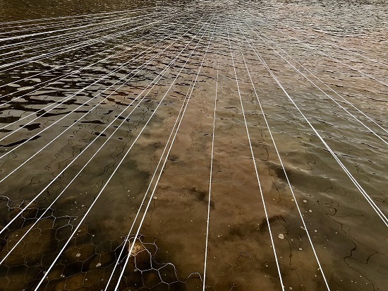 一束光从水底射向湖边,用白色绳子的射线状密集排列出另一个维度空间,用直拉的线条去感知隐于背后光的真实。