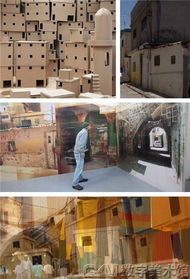 “幽灵现,幽灵隐”展览中的迷宫墙上不断变幻的图像,进一步增强了有趣的玩乐与迷宫的错位效果产生的扰人困惑之间的脆弱分界线。从迷宫中挣脱, 迎面而来的“纸板城市”使观者瞬间经历一个空间和物质的突然转变。看似在废弃仓库中随意堆砌起来的纸板盒,或住宅模型,却不是“模型城市”。如您对拥挤在山坡上的小镇或难民营有所印象,这就可联想为拉马拉(约旦河西岸巴勒斯坦地区的城市)中庶法特难民营中混乱无序的建筑群,或巴西的贫民窟,甚至拥挤的香港。