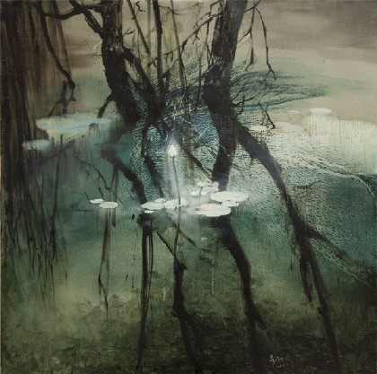 刘景弘的作品则颇具男性的开阔与大气。《风景》系列中,画面大多是残败萧瑟之景,艺术家试图摒弃人类的痕迹,只留下纯粹的自然景观,亦或将自己作为人的本位做某种转换,他可以是一棵树、一尊石、尘埃、大地……艺术家偏爱墨色,这让画面的语言处理没有明快美好的感觉,而是充满一种神秘感。《风景》系列的诞生源于对自然的偏爱,并希望实现达到“道法自然”的“无为”境界。