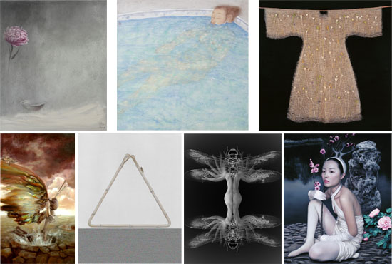 左下:蝶陈芸 《变系列之十三》 200×115cm 布面油画 2011 中下1:吴笛笛 《竹Bomboo No.》 中下2:黄莺 《嬗No15》 摄影,收藏集输出 200×150cm 2010 右下:何红蓓