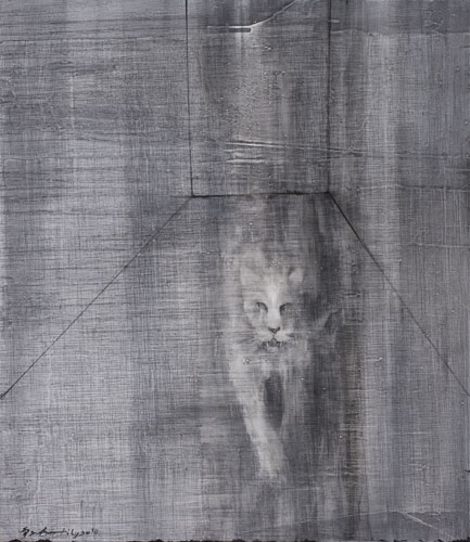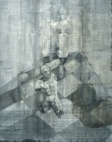 看栗子的作品,会有一种超时空的感觉,她将无形的精神和观念变成有形和可感的图式,可以直接进入虚幻而神秘的境界,是灵界,也是冥界的描述。她试图尽力保持时间的尘埃,在大片暗沉的上面铺上一些淡淡的光线,隐隐约约。在栗子呈现的语境里,可以感受到她的敏感度可以通灵,对物象的构形以及营造整体画面的氛围,对绘画技巧的把控,都体现了她的智慧和才情,她更注重的是灵魂的表达,尤其是大境的表达,通过经典的雕像来倾诉经典消失的无奈和疼痛,通过狮子,来表达王的影子以及精神上的隐喻。她的理性和冷静,使得她对死亡的感知更具自我判断,并且找到了穿越生死线的那道光。