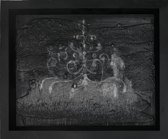 栗子的作品较之以往的作品,多了一些不安定和不确定的因素,在大片黑色的背景中,可以感受到巴洛克式风格的古典意味,隐隐约约,时隐时现,这种神秘而神圣的氛围,使得自己处于一种恐惧和危险的空间,对未来的不可预知感到恐惧万分,就像我们对于未来方向和价值难以掌握和确定,这种无助感,也会像地震来临和台风袭击,黑色和淡黄色在证明当下和过去,生命迷失在影子里,影子迷失在发黄的时光中,也像在大海中握住一块木板在漂移。沉浮的无奈,也是生命个体的无奈,图式中的吊灯恰好符合了这一意象,看不见的风景中藏着最清晰的哲学镜面,对着一照,原来每个都有魔鬼的面孔的一面,那些躯体就是复活的雕像,虽然残缺,却在多维的空间,呈现最完美的姿势和表情。