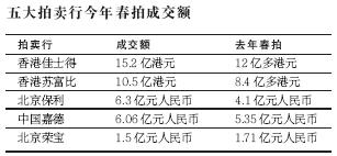 今年春拍中,中国嘉德、保利、荣宝、匡时和诚轩京城五大拍卖公司,联手获得18亿元的总成交额,而去年这5家春拍总额为14亿元。相较去年,今年增幅近33%.