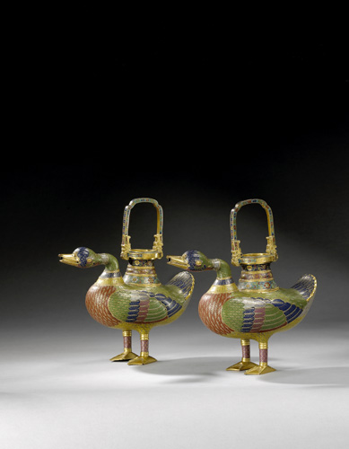 一对清乾隆掐丝珐琅鸭形提梁香炉,成交价为1,152,000欧元。该对香炉造型独特,线条流畅。色彩丰厚鲜丽,是当时掐丝工艺中极高水平之作。