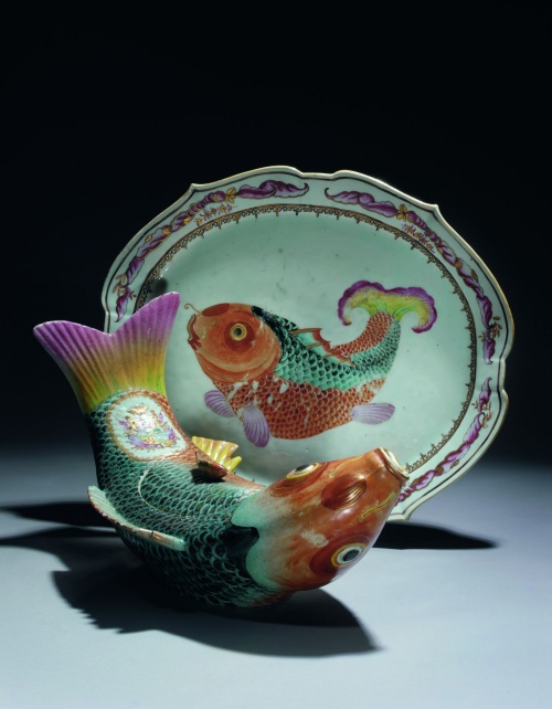 一件清乾隆粉彩鱼形纹章盖缸连盘,成交价为748,800欧元,创下中国外销瓷器皿世界拍卖纪录。盖缸鲤鱼作摆尾之状,型态生动,栩栩如生,彷如在水中嬉戏,跟盘中的鲤鱼图案相映成趣。此珍品颜色鲜丽,匠心独运,实是不可多得的杰作。