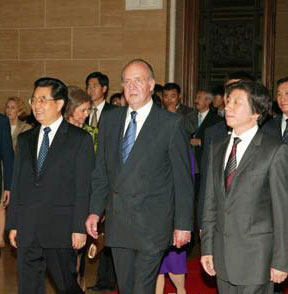 6月26日晚,中国国家主席胡锦涛和西班牙国王胡安·卡洛斯一世在中国美术馆参观了由中国美术馆和西班牙国家对外文化推广署、普拉多国家博物馆联合主办的“从提香到戈雅——普拉多博物馆藏艺术珍品展”。作为西班牙文化年的重要项目,“从提香到戈雅——普拉多博物馆藏艺术珍品展”为中国观众带来十六世纪至十八世纪西方绘画史上包括提香、里贝拉、委拉斯开兹、委罗内塞、丁托列托、鲁本斯、凡·代克、戈雅等人在内的一批艺术大师的52幅经典名作。胡锦涛主席和卡洛斯国王在文化部孟晓驷副部长、中国美术馆馆长范迪安和普拉多博物馆馆长米兰达、策展人胡安·鲁纳等的陪同下饶有兴致地参观了展览。