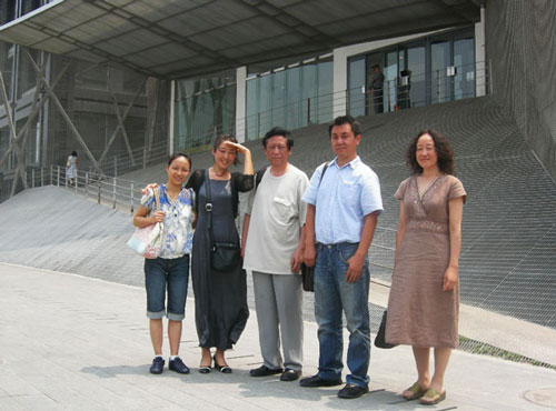 今日美术馆副馆长李小倩、天津工业大学艺术学院马静副教授、解基程院长、许正力副教授、金百洋教授在今日美术馆建筑物前合影
