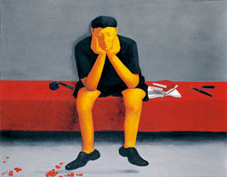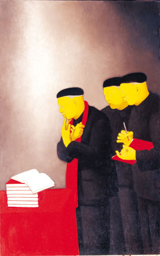 管勇的艺术,立足于上述,以艺术进行多面审视思考,以具有强烈的个人独特艺术语言特征及理念,展现他对中国社会当下性、时代性的现象问题的关注。那启发于具有“知识权力”象征意义的“笔型”的人物造型形象,那源于艺术家所出生成长的独有民族文化之根——红、黄、黑为主的色彩运用及象征意义,那红帏帐、红皮书(值得注意的是,有些书是被打开的,而且是空白的)、红围巾(或红领巾)、红墨水等的另类内涵,这一切似乎昭示着中国当代人的一种自身主体意识及状态的转变过程。展现着艺术家对这个时代中的人的新思考。