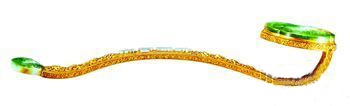 翡翠“B货”是指为增加翡翠的透明度,经化学和物理方法处理后的翡翠。一般经营者是这样处理“B货”翡翠的:用浓盐酸、浓硝酸等配制成的“王水”,浸泡翡翠原料或成品,这样做是为了将原来杂质较多、透明度不高、不美观的翡翠里的物质扩散甚至溶解,并有利于填充别的颜色。这是一种强腐蚀过程,因此,翡翠的内部结构已经遭到了破坏,变得非常疏松。为了达到更完美的效果,还要向其中注入一些有机胶加以粘固。这些有机物相对来说比较稳定,并且没有放射物质,所以一般来说,对身体影响不大。经处理后,原本混浊的翡翠变得又透又亮,比原有的颜色更为好看。