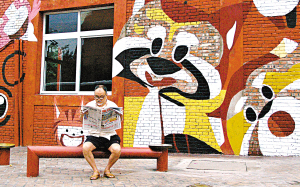 涂鸦与建筑的MIX,让昔日的建筑穿上了最时髦的外衣,这些涂鸦作品先由艺术家画出草稿,再由工人和美院学生按比例放大绘制在楼体上。各种涂鸦元素在一栋栋楼房间自由转换、跳跃——从线条到抽象的符号,从卡通形象到具体的人物形象,这里的涂鸦都以一种平和、快乐、幽默的形式表现出来,丝毫没有国外愤青们爱表现的恐怖形象。连四川美术学院院长、著名油画家罗中立的代表作《父亲》也用涂鸦的形式表现在一面墙上:“父亲”带着面具,别着油漆刷,很有点搞怪的味道。