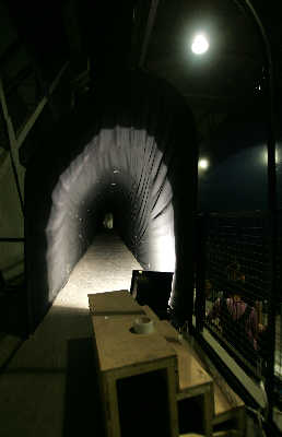 龚彦是这次展览的中方策展人,她带领记者浏览了所有的作品。说是作品,其实不准确。它们都还是“半成品”,艺术家的创意依然还遮蔽在那些电子控制台、电线和脚手架背后,但作品的雏形已经形成。比如展厅中央一个巨大的球体内部其实是一个互动影院,比如沿着缓坡架设起来的那个漫长通道,是为了营造观众面对作品时的心理落差,再比如地上放着的那几个不起眼的铁架子,其实是让人站上去用身体的摆动控制某些装置的。怎么形容呢?就像一个装配车间,甚至是秘密武器的兵工厂,在展览开幕之前就撩拨、勾引了你的好奇心,欲罢不能。