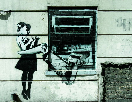 近日,英国媒体做了一次“本国最伟大的艺术家”调查,结果让人大跌眼镜,从未现身过的涂鸦小子班克斯荣登榜首。班克斯1974年出生于英国布里斯托尔,因经常在公共建筑物上创作涂鸦而闻名。他曾把帕丽斯·希尔顿的同名CD封面替换成“狗头暴乳”而大卖,还把伊丽莎白女王的头像替换成猴子。去年12月,他的一幅名为“女孩和鸟”的喷绘涂鸦拍出29万英镑天价。如此走红,却如此神秘,这可能就是他令无数名人疯狂的原因。