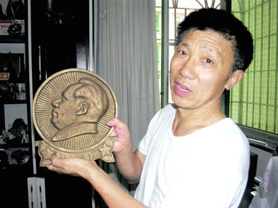 王强拿起一个直径约30公分的铜质毛主席像章对记者说:“这枚像章做工很粗糙,但却有一个传奇事故。”王老先生说:“上世纪六十年代,美国侵略越南,我国抗美援越,在越南的防空阵地上,我国的防空部队用高炮打下了美国的B52飞机,战士们怀着对毛主席的深厚感情,用飞机残骇铸造了毛主席像章,以表达防空战士对人民军队缔造者的敬意,这枚像章虽然做得不精致,但很有历史意义。”