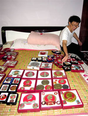 由于他对毛主席怀着这么深的感情,就萌发了收藏毛主席像章的念头,从1989年开始,着手收藏毛主席像章,他利用出差的机会,到外地收藏市场寻找毛主席像章,几乎每次出差回来,他都要带回一些,19年来,他收藏的毛主席像章已经有1万多枚。