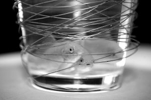 设计师白刚的两大主题设计都与“蚕丝”有关———瓶瓶罐罐上都绕满了铁丝,盛满水的花瓶中,三条小金鱼游来游去,远远望去,犹如在蚕茧中寻找出路———作者以此提出了双重命题———作茧自缚还是破茧而出?