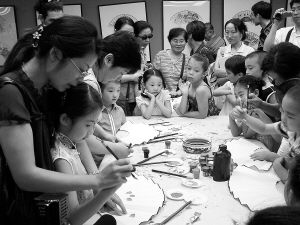 展厅中,一群小孩在老师的辅导下现场演示绘画扇面,瞧着他们用小手拿着毛笔、在褶皱的扇面上一丝不苟地画着花瓣、树叶,大人们啧啧称奇。让小孩画扇面不失为一种传承传统文化的途径。