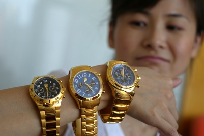 作为建军80年的献礼之作,这套名为“毛泽东金钻至尊套表”包括一枚白金怀表和三枚黄金腕表,四枚表盘上均镶有0.3克纯金毛泽东浮雕头像。其中,怀表采用纯白金材质打造,数字部分镶嵌12颗天然钻石,背面为毛泽东手迹《沁园春·雪》全文。而腕表则都是采用24k玫瑰金制作。