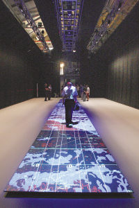 7月14日,参观者在观看作品“旅途”。由复旦大学上海视觉艺术学院、上海城市雕塑艺术中心共同主办的“身体·媒体-国际互动艺术展”在上海城市雕塑艺术中心开幕,来自9个国家的11位新媒体艺术家带来了他们的代表作和新作,这是迄今为止国内规模最大的媒体互动艺术展。