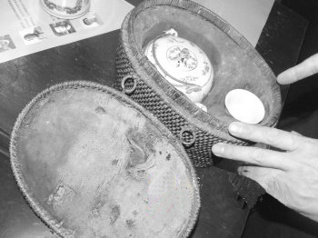 “扬州的宝贝真是不少啊!”“专家”掀起柳藤篮的盖子,拿出暖壶又看了起来,一看壶底,连声说:“同治期的。”为防“收藏者”不懂,该“专家”又补充说,就是光绪前面一位皇帝在位时的物品,距今100多年了,价格在5—6万。“收藏者”拿出一旁的瓷杯说,杯子好像不太配套。“专家”附和道:“是的,不配套,杯子是民国时期的。”