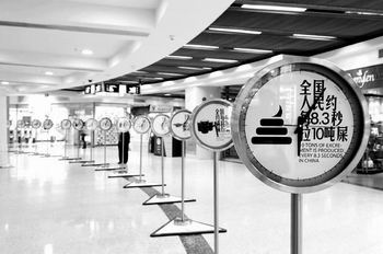 在这些涉及建筑、产品、视觉、时装、电影、声音等方面的作品中,最容易让人看懂的是安德鲁·拉祖查克(Andrew Lazorchak)、吴岚等人合作的参展作品《购物时间》,他们把有关中国的一系列统计数据印在16个大钟盘上——“全国人民约每8.3秒拉10吨屎”、“全国人民约每13秒吃10万个鸡蛋”……这相当于,就在你脱下脚上的旧鞋,试穿架上的新品的那一会儿,中国人民已经吃了10万个鸡蛋,拉了10吨屎。而这些数据的来源又非常“靠谱儿”——2006年《中国统计年鉴》。