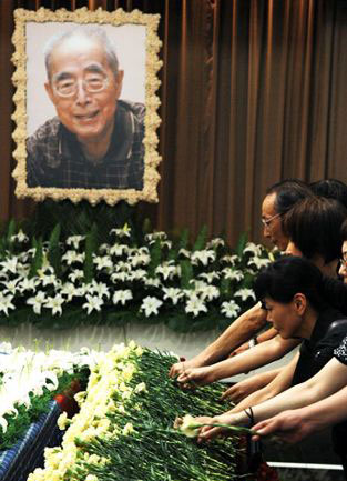 十点钟,上海博物馆馆长陈燮君主持了简短的追悼会仪式。记者在人群中发现,上海著名节目主持人曹可凡、著名滑稽演员王汝刚、李九松等多名沪上艺术知名人士来到现场为老人送行,而来自上海美术馆、中国书画院等二百多个书画界和各行各业团体及个人送来的花圈和挽联,更是将现场围得紧紧的。