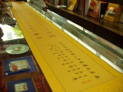 “《心经》印痕”是湖南省天心印社社社长、湖南省岳麓书画研究院秘书长、著名金石书画家李杲伟先生潜心创作而成。黄金版《般若波罗蜜多心经》印痕则是采用最新科技制造的长273.5厘米,宽22厘米的千足金宣纸为拓印底本,每卷耗黄金38克,寻访名家,精心选配以红珊瑚、玛瑙、珍珠粉等八种名贵丸调治而成的“八宝印泥”,以八宝印泥钤心经印于黄金宣纸之上。