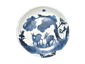 另外两件钵式香炉与瓷盘上面,则分别绘上了渔家乐与胡人狩猎图,同样画风飘逸,形神兼备。据梁秉南介绍,康熙青花瓷画风除了沿袭明末清初四王(王石谷、王石敏、王鉴、王原祈)的画风、线条流畅柔美之外,还有一个最主要的特点就是一蓝三色,即整幅画面均采用一种蓝色颜料绘成,但通过笔法交错晕染相结,从而营造出深浅不一丰富多变的色阶层次,令简单的色彩变幻出绚丽多姿的美丽。