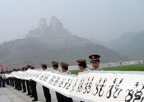 七月二十五日,河南书画学会副主席、东方之子国际书画院院长葛臣耗费三年时光,以象形手法书写出2008个形象各异的“龙”字,长卷共计一千零二十九米,堪称世界上最长的中国书法长卷。二十五日上午,这幅名为“龙舞奥运”的书法长卷在位于河南郑州黄河风景名胜区内的炎黄二帝广场前举行了开卷仪式,百余民众慕名前来参观,一睹长卷风采。图为开卷仪式。中新社发李志全摄