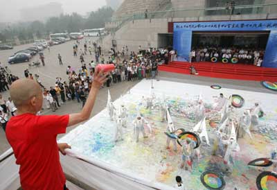 日本宝冢造型艺术大学教授岛本昭三先生现场创作了高空泼墨画作。他站在高台之上,手中拿着各种色彩的瓶子向地上扔去,瓶子砸在地上,里面的颜料四处飞溅,下面的人手舞足蹈迎接从上而下的颜料,形成一幅美丽的图画。