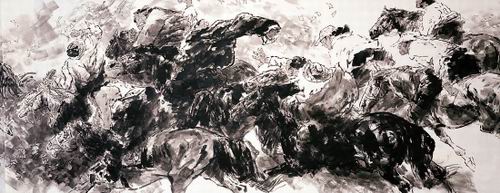 《祭山神》气势万丈、锐不可挡的感觉来自哪里呢?方增先告诉我说,《祭山神》画长14米,牵涉到成千上万个绘画单元,近距离作画非常困难,运笔节奏看不见,笔与笔的关系把握不住,怎么办呢?唯有用盲画的方法,大局在胸,一气呵成。方增先着重从以下几个方面入手,一是一画一题,决不画多余的东西,以稳定气势;二是截长补拙,原来构图长24米,显得冗长,缩短一半凸显主题,以强化气势;三是简化背景,以突出气势;四是多组呼应,中间群组拉长,前锋群组体现冲击力,后半部分余波不断,以连贯气势;五是群马连笔,在“群”字上下功夫,不画单一的马,而是着力群体,群马奔腾,笔线连绵,团块接榫,水墨一体,以营造气势。