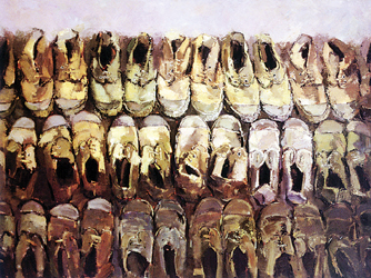 金黄色的沉甸甸的田野,映照着秋收喜悦的农妇,每一条皱纹都洋溢着自信的笑容;阳光逐渐被黑夜吞没,暮色笼罩了劳累一天的工人,仿佛是将要谢幕的电影的最后一个镜头,一把色彩鲜明的铁锹却忽然横空出世;三十多双旧胶鞋,因为褪色而斑驳的军绿让人想起那个特殊的年代,艰苦的岁月。