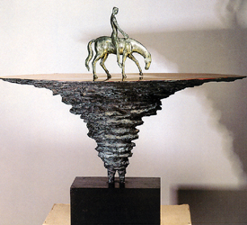士兵和马,行走在陡峭的悬崖之上。线条并不明晰,若隐若现的轮廓却把追寻演绎得恰到好处,作者原来是想表达寻找往事的这个主角。峰回路转,往事流落之处再难寻觅,空旷之中孤独的身影给观者一种沉重感。年轻的艺术家,有意无意地流露着尘封记忆的淡淡哀伤。