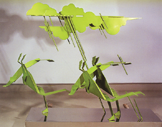 与此形成鲜明对照的,是激情四溢的雕塑作品。厚重的云朵,闪电豪雨,人们以夸张得近乎飞跃的体态奔跑着,那充满张力的轻灵身躯放射出激动人心的感染力,终于突破了速度的极限,“飘”了起来。这是作者渴望的自由状态,无拘无束地享受大雨倾盆的畅快淋漓。