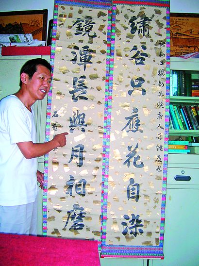 田申说他收藏的这幅刘墉的晚期书法作品,其中的片金装饰以及周围用五色织锦的裱绢极其罕见,显得富丽堂皇。上联闲章的来由是乾隆皇帝曾赐给刘墉一块写有“海岱高门第”的匾,刘墉以此作为荣耀,将这几个字做成印章。