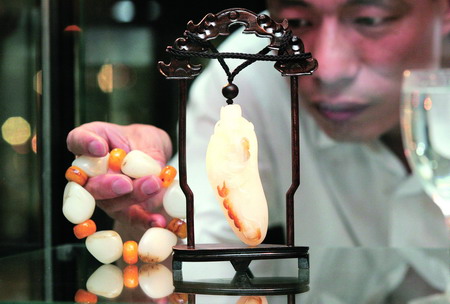 一件通体细腻润泽,洁白无瑕的羊脂玉作品《财神》惊现官园珠宝城,该作品重117克,是由中国工艺美术大师倪伟滨精心创作,堪称料绝艺绝的传世精品。由于该玉的质地纯正,专家为其估价至少在每克1万元以上,整件作品应在百万元以上。不少羊脂玉收藏者拿自己的精品与其比较,均逊色不少。