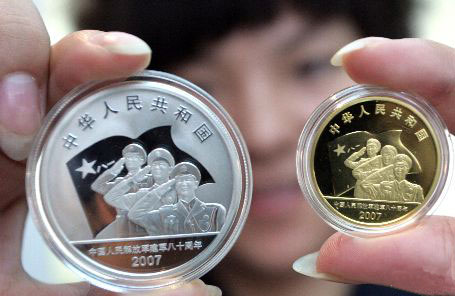 2007年7月31日,工作人员展示上市的“中国人民解放军建军80周年金银纪念币”。当日,中国人民解放军建军80周年金银纪念币在郑州上市。该套纪念币共2枚,其中包括1/2盎司圆形金质纪念币1枚,最大发行量10000枚;1盎司圆形银质纪念币1枚,最大发行量30000枚,均为中华人民共和国法定货币,纪念币正面图案均为中国人民解放军军旗与陆海空三军人物形象造型,并刊有国名、年号及“中国人民解放军建军八十周年”中文字样。中新社发陈代述摄