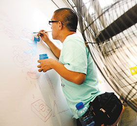 “绿校”五岁了!昨日下午,为了给这个非职业艺术青年团体过生日,绿校成员们聚集到798的潜空间画廊进行了一场现场涂鸦。策展人李贵明认为,绿校已经由当年抵制日本漫画的成立初衷变成了现在的非专业艺术人士的一种生活方式。