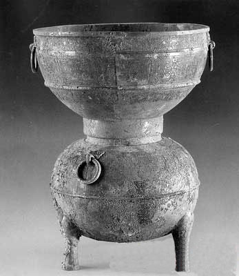 通高29.5厘米,甑高12.6,口径22.5厘米,鬲高16.9,口径9.6厘米。1988年太原出土。甗,古代蒸煮用的炊具,全器分上下两部分,上体称甑用以盛粮,下体为鬲,用于煮水。即现代俗称蒸锅。早在新石器时代就有了陶制的甗,商代出现青铜甗,并成为重要的礼器。早期铜甗为上下一体,春秋以后分体甗流行,到战国晚期及汉代,下部的鬲逐渐演变成釜形。甗多为圆体,西周时期曾出现过方体的甗,为数极少。