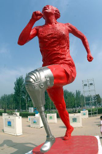 8月8日,2008年奥运会倒计时一周年之际,来自世界各国各地区的300多件奥运景观雕塑国际循环展在北京世纪坛广场隆重展出。该展已在20个城市进行了巡展,并广泛征求民众选票,力求评出大众认可的29个金银铜奖。图为中国江苏周阿成雕塑作品“极限速度”。
