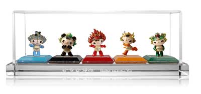 这套镶嵌了2600颗人造水晶石的吉祥物纪念品,由北京奥组委授权制造,名为“晶彩”福娃和“吉庆团圆”福娃套装的奥运特许产品在京首发,并陆续在全国奥运特许商品零售店中亮相。