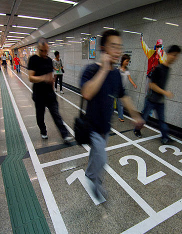 8月13日,乘客们从广州地铁公园前站被搞成“跑道”形状的通道上走过。