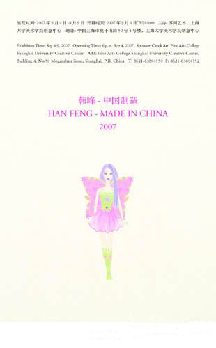 “韩峰—中国制造2007”将于2007年9月4日下午六时在莫干山路50 号上海大学美术学院创意中心开幕,本次展览由苏河艺术和上海大学美术学院创意中心联合主办,集结艺术家韩峰中国制造作品的两大系列——日常用品、芭比娃娃共45件作品,作品多为2003年到2007年创作的绢上作品。展览从9月4日开始,至9月9日闭幕。
