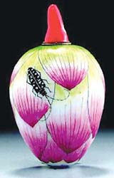所谓“仿生类鼻烟壶”,就是让鼻烟壶仿胡桃、藕、石榴、茄子、花生、螃蟹、海螺等形象,与传统意义上的鼻烟壶造型有着很大的区别。在此次拍卖中,一件料胎画珐琅半开莲花形鼻烟壶十分抢眼(如图),此壶呈半开莲花形,含苞待放,花瓣层层重叠,姿态动人逼真,彩绘精细自然。