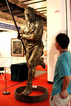 今年的中国艺术博览会不仅声势盛大,而且展出的作品内容非常丰富。记者在现场看到,很多美术、雕塑作品都创作了体育题材作品。袁熙坤的雕塑作品《撑杆跳之王——布勃卡》以矫健的身姿吸引了很多观众的目光,而在一些传统的国画作品中,鲤鱼也成群结队开起了“运动会”,画家们希望用体育主题的艺术作品来表达自己对北京奥运会的一片祝福。