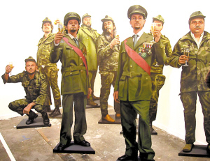 身为ARCO的元老的Ferran Cano画廊,展出让军队与教会双双气结的作品,艺术家Martin和Sicilia这一对年轻人自1995年开始合作至今,他们在会场设置了一间实物大小的马厩,里面有西班牙军官拿着香槟酒向参观博览会的访客举杯祝贺,表达军人意气风发、耀武扬威的画面,在两位艺术家的安排之下,化为令人发噱的讽刺之作,这件装置作品也曾在去年10月的科隆艺博会展出,价值15000欧元。