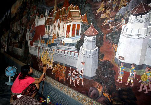 八月底,画师认真修饰泰国曼谷大皇宫内的壁画,以迎接泰国国王大寿日的到来。离泰国国王普密蓬年底八十大寿还有四个月,大皇宫已开始加紧维修修饰。王丽南摄