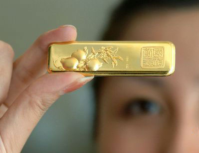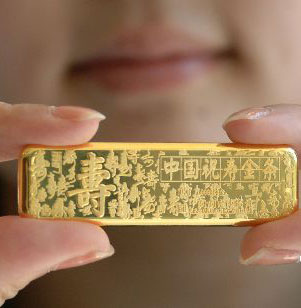 8月29日,中国首款专为老人生日量身定做的“中国祝寿金条”正式上市。该金条采用AU9999纯金打造,分为30克、50克、100克(图)、200克四种规格,全国限量发行999套,每一根金条都有唯一限量编号和证书。国内零售价为每克199元人民币。金条正面雕刻的是历代书法家所书写的60个寿字,其中有乾隆皇帝御笔亲题寿字,背面是国画大师齐白石所画《寿桃》。