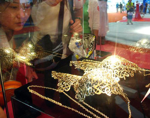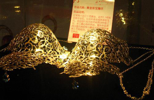 9月1日,一款黄金珠宝胸衣亮相“迎奥运北京工业品牌展览会”时装之都品牌展。据悉,这款胸衣采用630克黄金,7.5克拉的南非钻石,及价值连城的多色宝石,经由国际知名技师耗费2000多工时手工精制而成。整件作品采用中国古典纹样与雕梁画栋的镂空镶嵌工艺结合,呈现出精美绝伦的东方神韵。