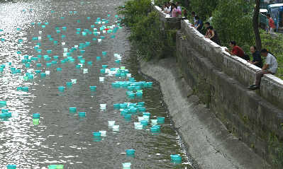 昨天下午2时半起,苏州河西藏路桥至乌镇路桥之间两三百米的水面上,陡现一只只或绿或红的脸盆,慢慢地漂散开来,至下午4时左右,已达近千只之多。河中一艘木船上,一红衣红裤男士率四五名环卫工人仍在不停地往河中扔脸盆。此举引得此段苏州河两岸行人纷纷围观。