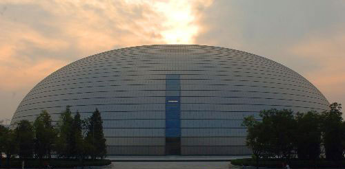9月9日傍晚,在晚霞衬映下的北京国家大剧院。 中新社发 邹宪 摄